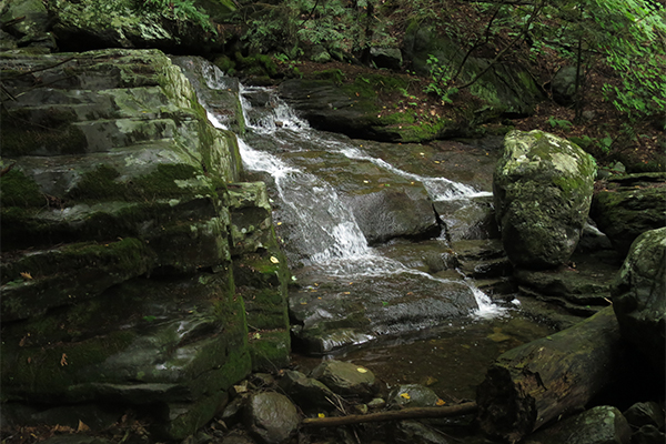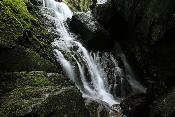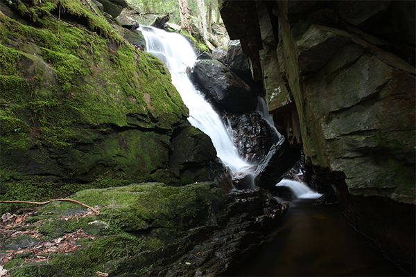 a view of the upper falls at Abbey Pond Cascades from within a gorge